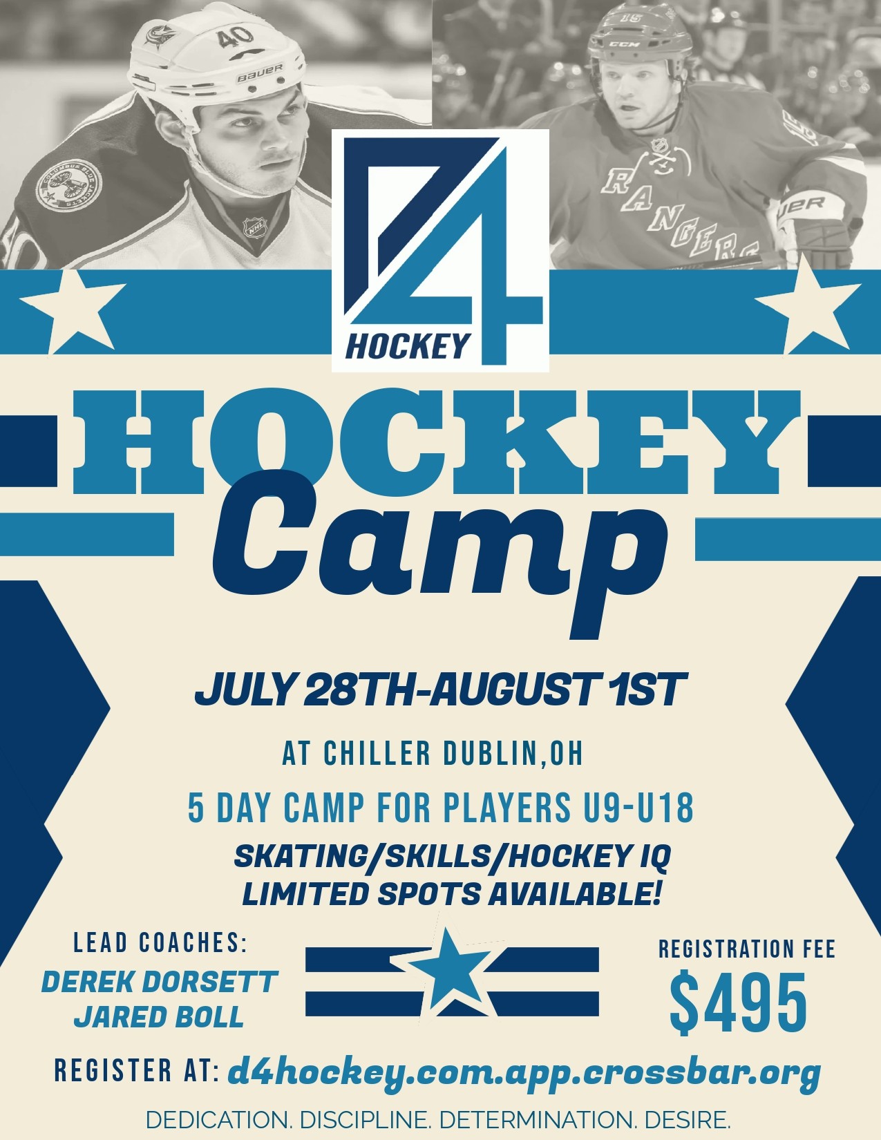 Come experience the "D4" way to play! High-level professional development style camps led by NHL Alumni and current Columbus Blue Jackets Assistant Coach Jared Boll, and NHL Alumni and former NHL Development Coach Derek Dorsett. Sessions will focus on skating, puck skills, and small-area games to develop hockey IQ. Players will be introduced to a new development style and skills they can continue on their own throughout the year. The perfect way to close out summer and gear up for hockey season!